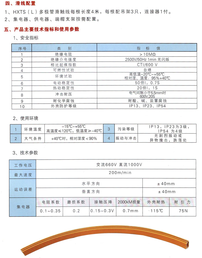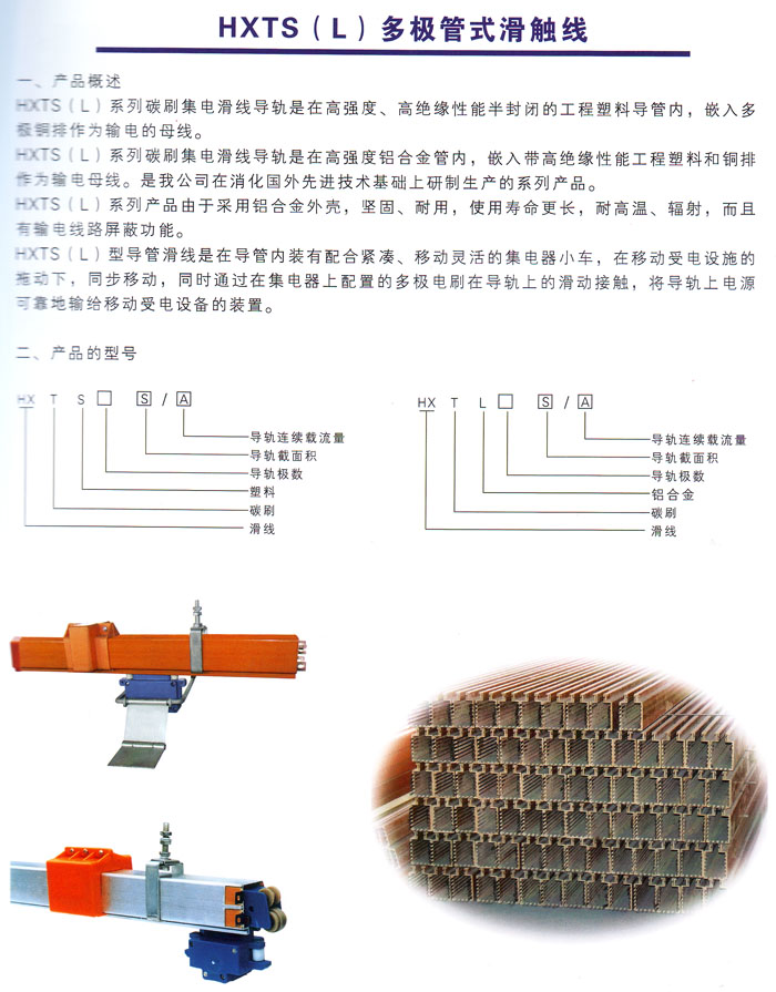 注:1、滑触线标准长度:4m、6m。 2、滑触线极数:3-6极。 3、HXTS与HXTL相同,前者外壳为塑料,后者外壳为铝合金。