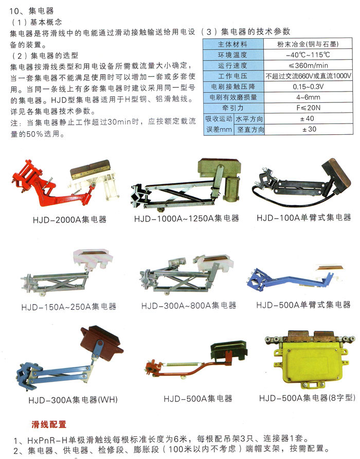 注:1、滑触线标准长度:6m。 2、HXPnR-H与HXPnR-H B 以及HXPnR-H A 性能相同,几何形状和集电方式不同。 3、HXPnR-H型有铝合金和铜体两种材料的滑线。