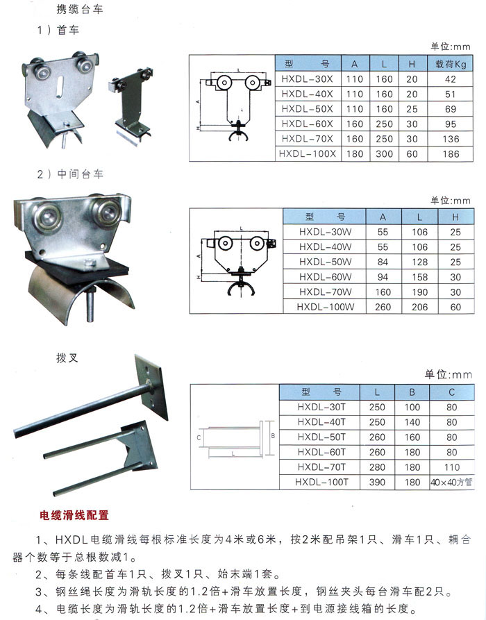 HXDL系列电缆滑线由轨道、携缆小车、电缆以及悬吊、固定等组件组合而成。该产品以其简便的结构、完备的性能被广泛地应用于铁路货场、港口码头以及烟草机械等行业的起重运输机械的移动供电和信号传输系统中。